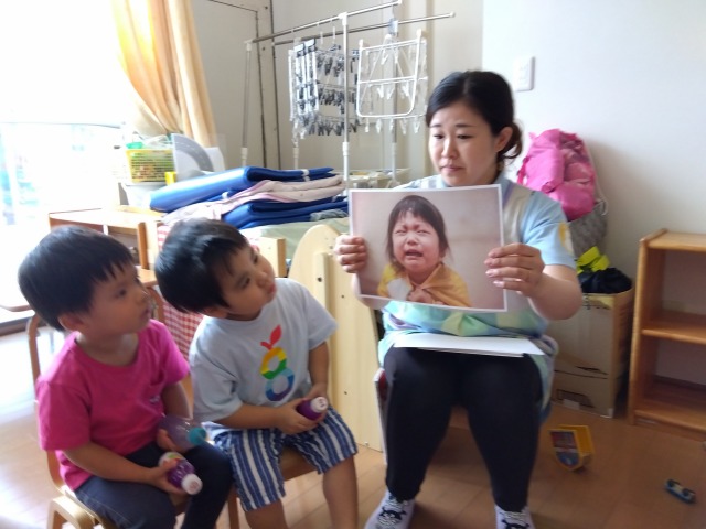 この3つを話していくと次第に理解し、笑っている保育者を見ると「黄色い気持ちだね」などと言う姿もありました。