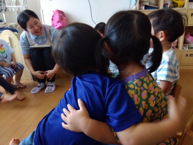 また、“ちくちく言葉とふわふわ言葉”という絵本を呼んでいき、どんな言葉が悲しい?嬉しい?などと一緒に考えていきました。最後には「○○ちゃん大好き」「○○くん大好き」などとお友だちと抱きしめ合っている可愛らしい場面も見られましたよ。