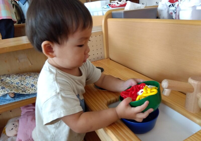 1歳児クラスでは、少しずつ見立て遊びが上手になりままごとを楽しむ姿が見られるようになりました。チェーンを使って“ちゅるちゅる(麺類)”や“ごはん”を作っている様子やジュースを使って「かんぱーい」と言って友だちと一緒に飲む様子など様々な遊ぶ姿が見られています。また、最近では子どもたちの遊びがより発展するよう、鍋やフライパン、調味料などを用意しました。
