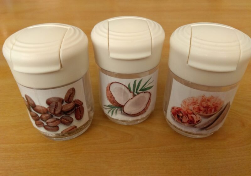 調味料は、実際の物を中に入れ匂いを嗅ぐことが出来るようにしました。子どもたちの身近にある鰹節や少しなじみのないココナッツなど様々な物を用意すると子どもたちは匂いに興味深々で何度も匂いを嗅いだり、「いいにおいだね」と話してくれたりする姿が見られます。