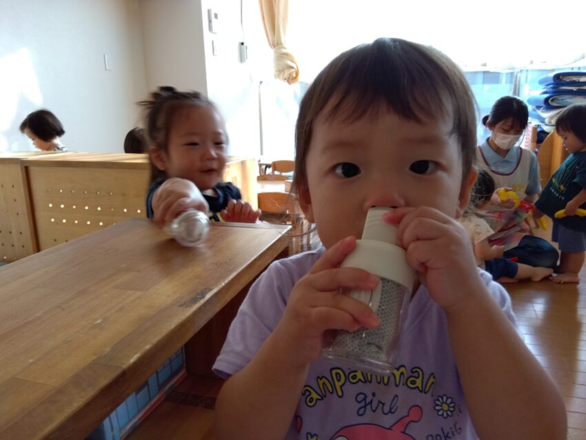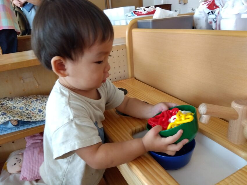 1歳児クラスでは、少しずつ見立て遊びが上手になりままごとを楽しむ姿が見られるようになりました。チェーンを使って“ちゅるちゅる(麺類)”や“ごはん”を作っている様子やジュースを使って「かんぱーい」と言って友だちと一緒に飲む様子など様々な遊ぶ姿が見られています。また、最近では子どもたちの遊びがより発展するよう、鍋やフライパン、調味料などを用意しました。