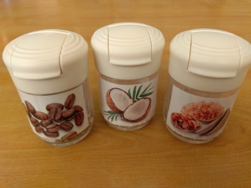 調味料は、実際の物を中に入れ匂いを嗅ぐことが出来るようにしました。子どもたちの身近にある鰹節や少しなじみのないココナッツなど様々な物を用意すると子どもたちは匂いに興味深々で何度も匂いを嗅いだり、「いいにおいだね」と話してくれたりする姿が見られます。