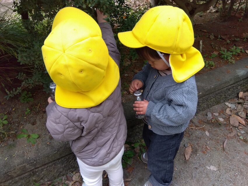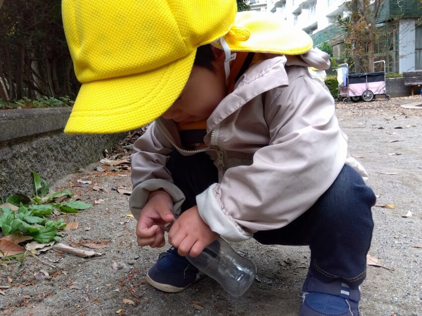 普段から探索が好きな子どもたちも多く、保育者に袋やボトルを貰うと真剣に探したり集めたりしている様子がありました。