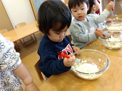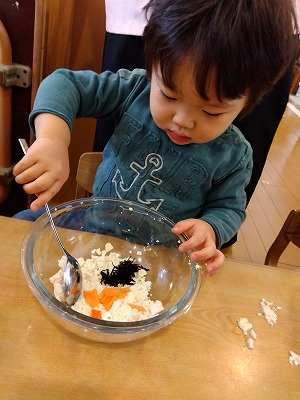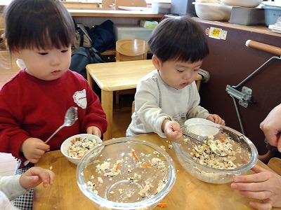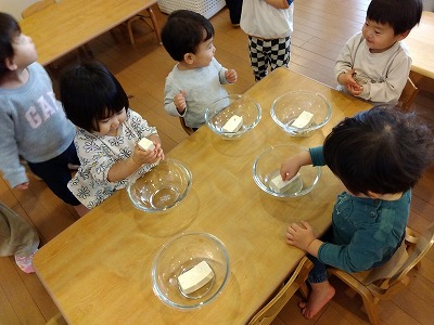 栄養士が持ってきた豆腐に興味を持ち“じー”っと観察したり、指先で“ちょんちょん”と触れたりして感触を楽しむ姿が見られました。中には、「つめた~い」と感触を教えてくれる子もいました。マッシャーを渡すと、上手に握りながらつぶすことが出来ていた子どもたち。豆腐を潰したあとは、にんじん・ひじき・調味料を入れて混ぜました。「まぜまぜする!」「おいしそうだね~」などと声を出しながら調理を楽しむ姿が見られましたよ。
