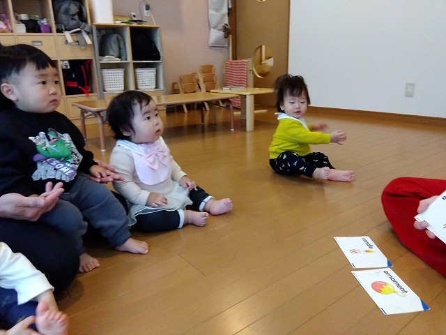 英語教室は4月から毎月1回行っており、4月は初めて会う英語の先生に緊張している姿がありましたが、徐々に先生に慣れてきて、英語を話している先生の顔をじっと眺めたり、歌が聞こえてくると体を揺らしたりする姿が見られるようになりました。