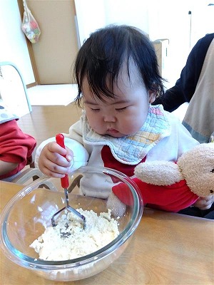 今までの食育では様々な食材に触れ興味を持ち、感触を楽しむことがねらいだったのですが、今回は豆腐をつぶすことから始まる簡単な調理を楽しみました。