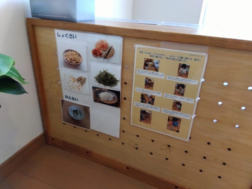 以前紹介している食育やスポーツプログラムの写真などは、子どもたち自身が活動で行ったことを楽しい気持ちで思い出すことが出来るように、各スペースに設置しています。写真に気付いた子どもたちは、指差しで写真の中の自分や友だちの存在を認識したり、名前を呼んだりしています。会話の中で保育者から活動でどんなことをしたのかを尋ねられると、思い出しながら食材の名前や運動で行った動きなどを教えてくれる様子も見られました。また、運動マットで遊んでいる際に、ふと写真に興味を示して一人でじっと写真を見つめている子がいると、その友だちを見付けて気が付き複数の子どもたちで一緒に写真を囲んでいる姿も見られます。