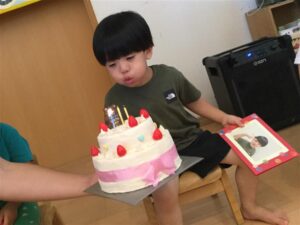 実際に歳の数だけロウソクに火をつけて吹き消すのですが1歳クラスのお友だちは恥ずかしそうにしていたので保育者と一緒に吹き消しました♪2歳児クラスのお友だちは自分の力で気持ち良く消してくれました。