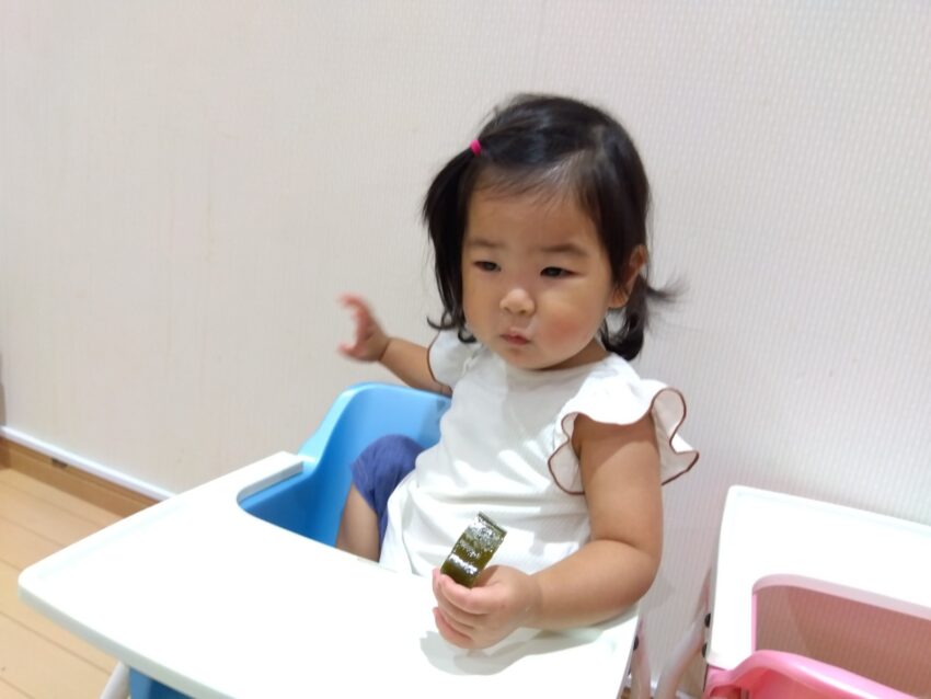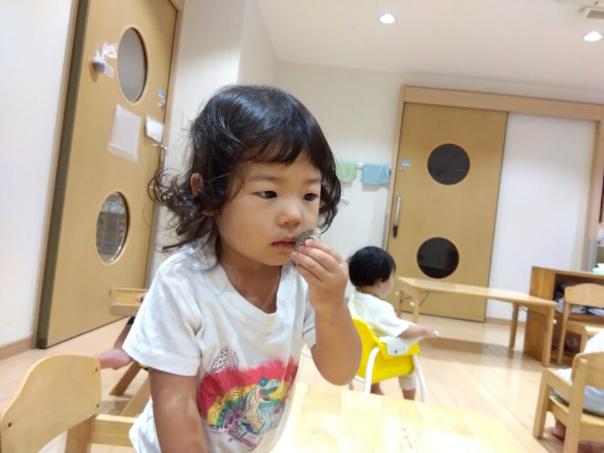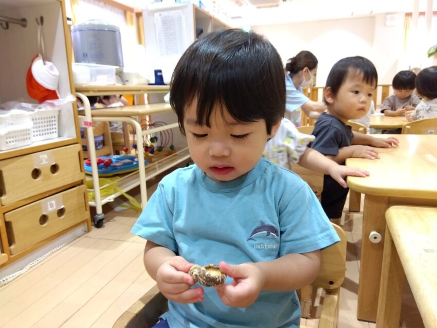 水に浸したしいたけなども触り、おいしそうに見えて口元に運ぼうとするなど興味津々な様子でした☆