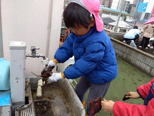 サツマイモが顔を出しているところがあり、「おっきいのできてるじゃん!」と楽しみにしていました。グループに分かれて掘り始めると、土が硬かったり、冷たかったり、大きくてなかなか掘りだせず苦戦していたりしましたが、みんなで協力して掘り進めて取れると、とてもうれしそうに教えてくれました!