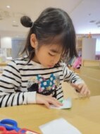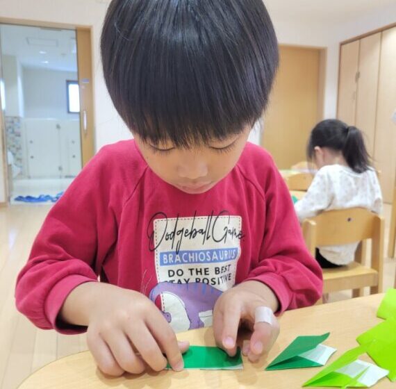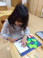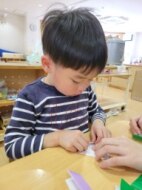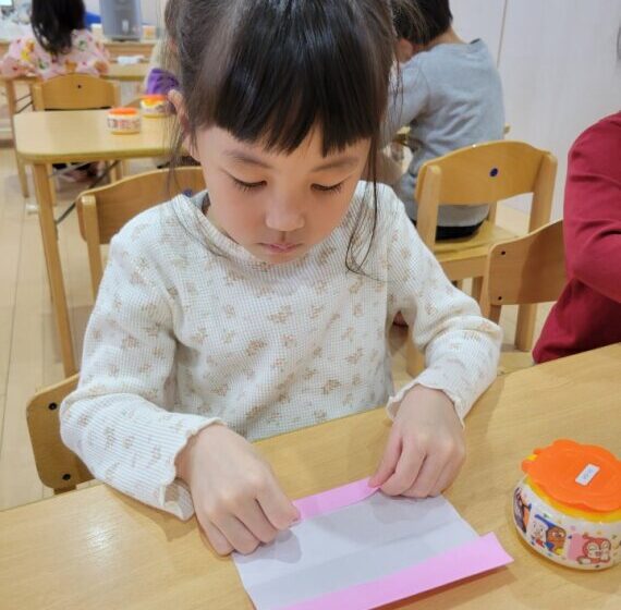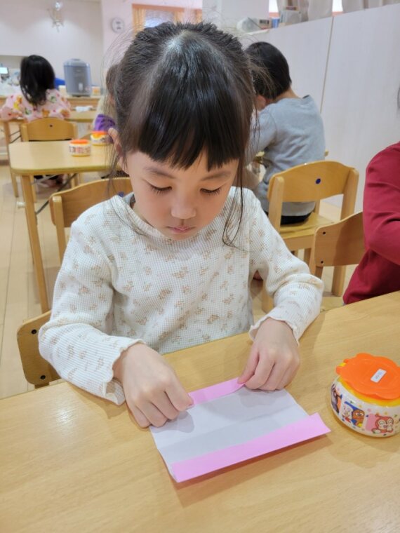 はさみものりも色鉛筆も使って、折り紙を折ったり自分でつけた折り目に合わせて切ったりした後は真っ白な紙にお手紙!