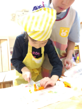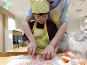 にんじんとだいこんを切ることをお願いされたくじら組は、包丁を使うのは2回目なので、「覚えてるよ!」と積極的に参加してくれました!