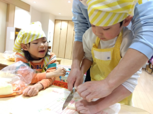 お手本を見ながら大きくなりすぎないように慎重に切っていたり、手を切らないように左手は猫の手で丸くしていたりと真剣に取り組んでくれました♪
