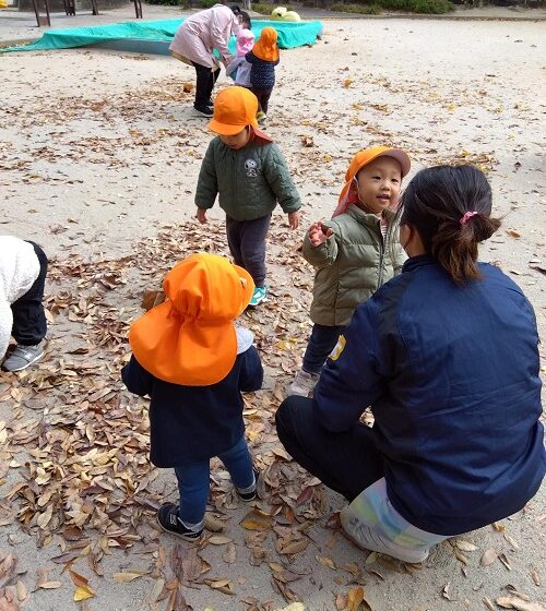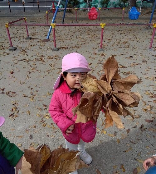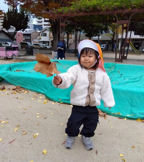 公園へでかけました!子どもたちは落ち葉を拾い、根元をもってくるくる回したり、たくさん集めては嬉しそうに遊んでいました🙌