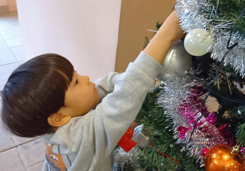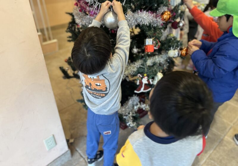 子どもたちの高さからでは大きいクリスマスツリーの上部には手が届きません💦 「せんせい、だっこして~」「上の方につけたい!」と意欲的な子どもたちのおかげで高い所まで飾りつけすることができました🤗