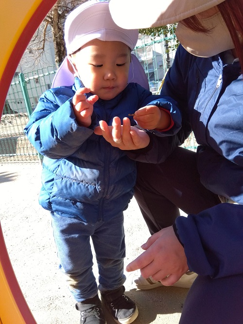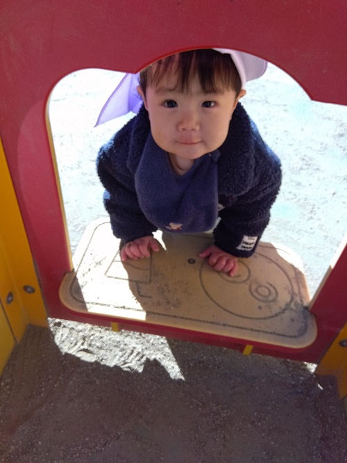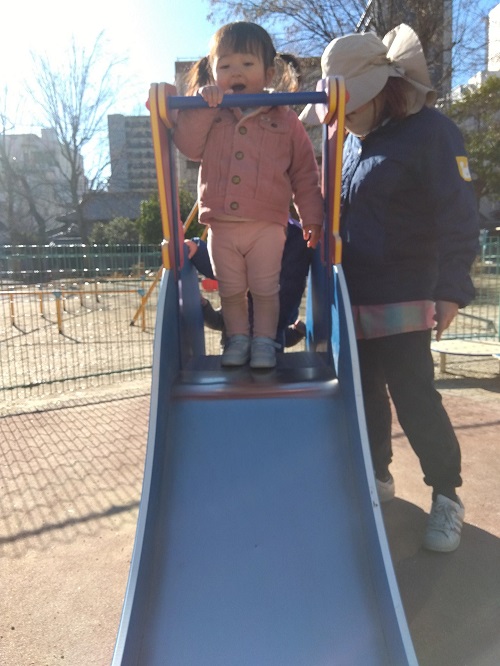 天気の良い日に、公園へ出かけて遊びました🙌すべり台を何度もくり返し滑ったり、小さな遊戯のお家から顔をのぞかせたり、砂をひろって先生に見せてくれたりと、それぞれが好きな遊びを見つけて楽しんでいました🌸