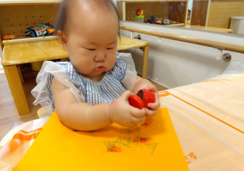 保育者と一緒に押したあと、自分でスタンプを持って画用紙に押そうとする姿も見られました。