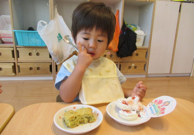 ぽけっとランド中野坂上はおにぎりや蒸しパン、スコーン、ホットケーキなどなど様々な手作りおやつが毎日出ます♬この日はお誕生日の子がいてケーキも出ました🎂👏
