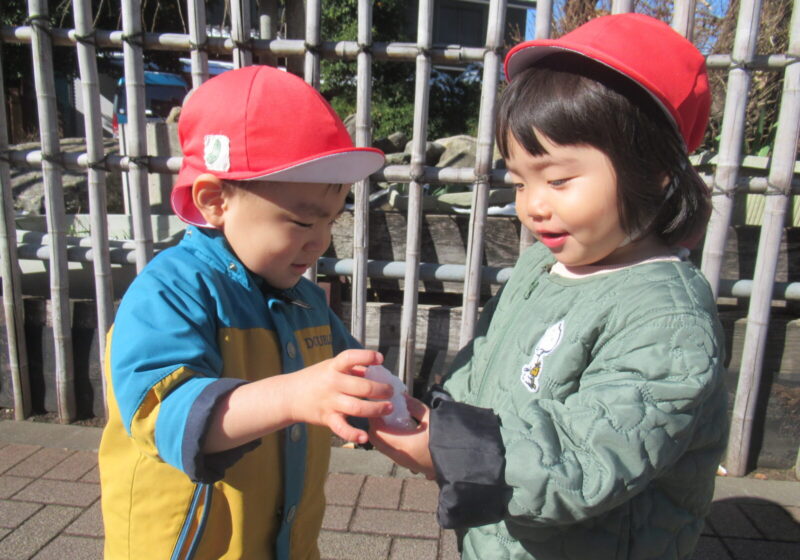 次第に慣れてくると、雪を丸めて積み重ねて雪だるまを作ったり、雪をパラパラと散らして「雪だ~!」とはしゃいだりと、笑顔いっぱいで遊ぶ姿が見られました😊