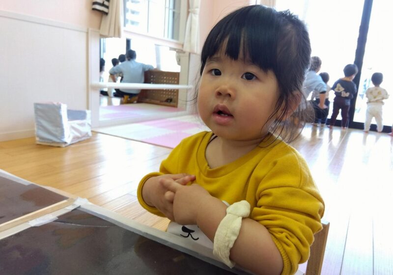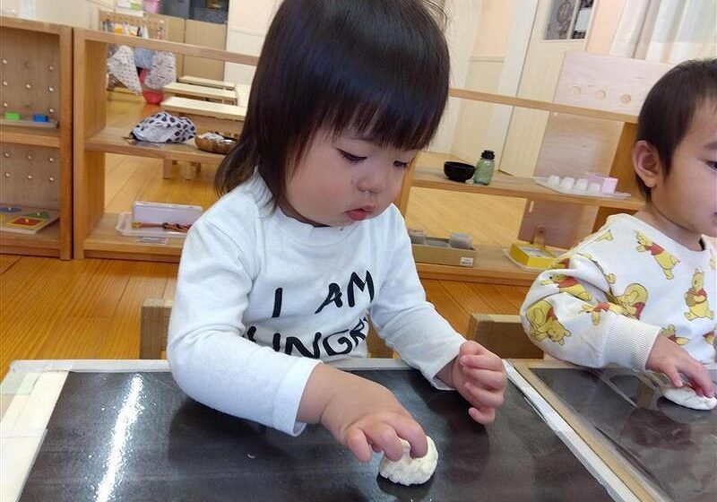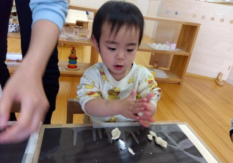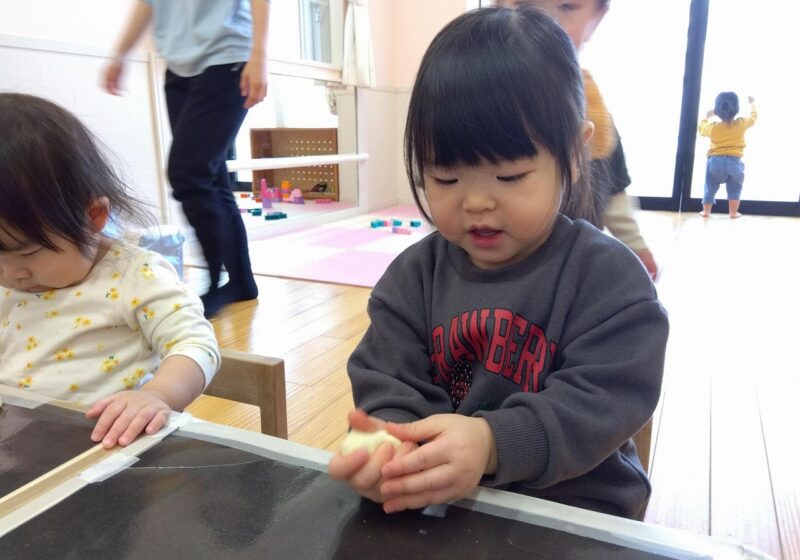 0歳児~小麦粉粘土~ 2026.02.25 小麦粉粘土で遊びました! 初めて見る粘土にどう遊んだらいいのか、指で突いてみたり恐る恐る触れてみる様子がありましたが、握って遊べることやちぎって遊ぶことが出来ることを伝えると、手一杯に握ったり小さくちぎって遊んでいました。 丸、パン、ほど長い形などを作ると嬉しそうに笑顔を見せていましたよ^^ 輪っかを作ると腕に通してみたりと楽しんでいました♪