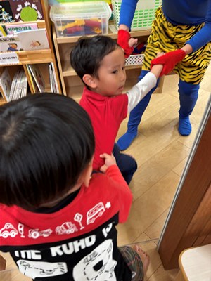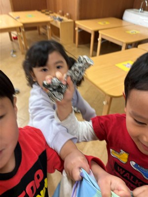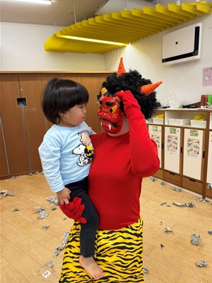 パイナップル・パパイヤ組(3・4歳児)では、担任の先生やお友達が鬼に連れていかれそうになると、勇猛果敢に豆を投げたり、エプロンや手を引っ張って守ってくれる子どもたちの姿がかっこよかったです✨