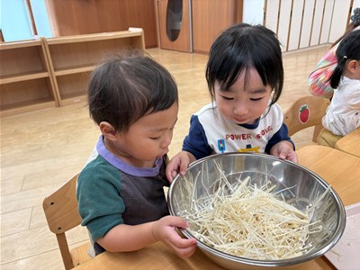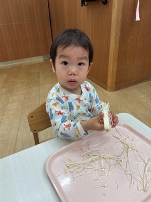 アセロラ組は初めての食育。ドキドキわくわくで、給食のスープに使うえのきをほぐすお手伝いをしてくれました!