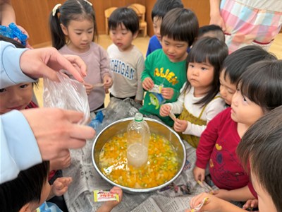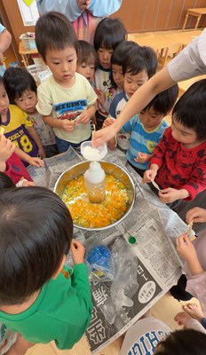 3/6(金)にアセロラ組(1歳児)、3/11(水)にごーやー組(2歳児)の食育と3/12(木)にパイナップル・パパイヤ組(3・4歳児)のクッキングがありました🍳