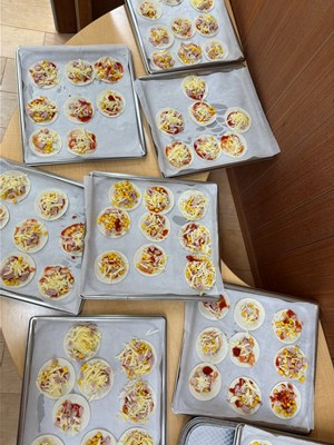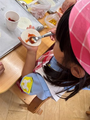 パイナップル・パパイヤ組はおやつのピザ作り!一人ひとり餃子の皮を貰うと、一生懸命ケチャップをぬりぬり〜、ソーセージにコーンにチーズを乗せて、オリジナルのピザ作りを楽しみました♪