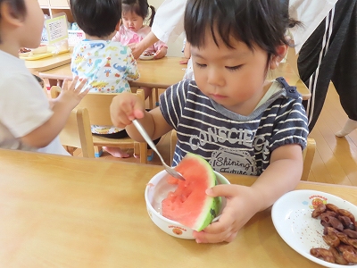 すいかのくり抜きでは、手首をくるっ!とひっくり返す動作が上手な子が多かったです。