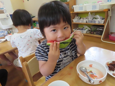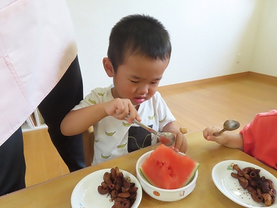 きゅうりの塩もみ、すいかのくり抜きなどを行いました。