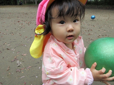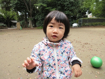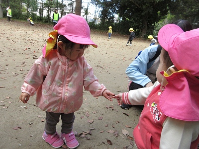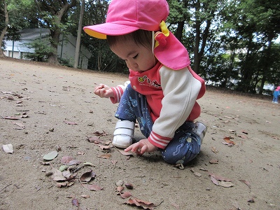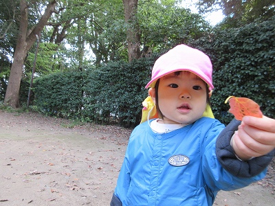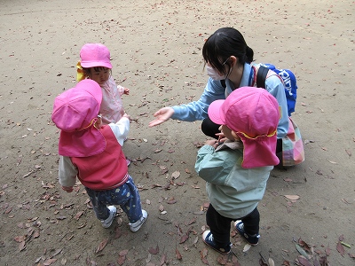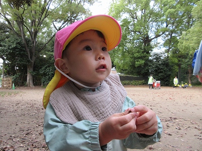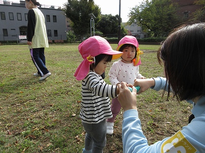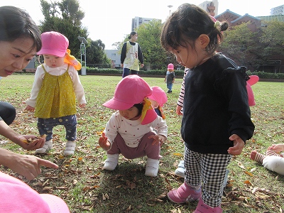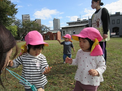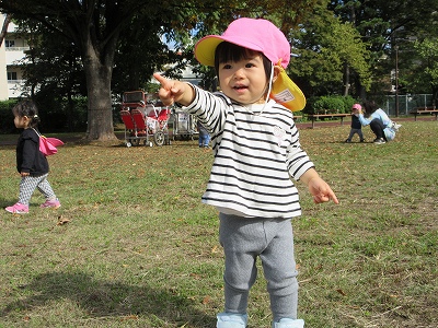 秋のお散歩を楽しむ0歳児クラス。