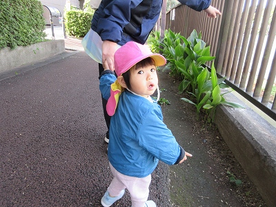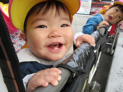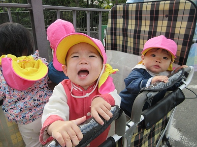 手を繋いで歩いたり、お散歩のカートに乗ったりしながら楽しみます。