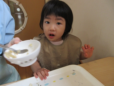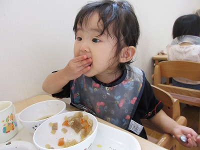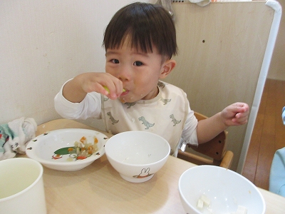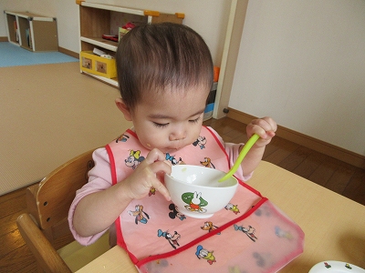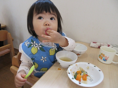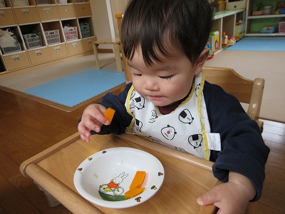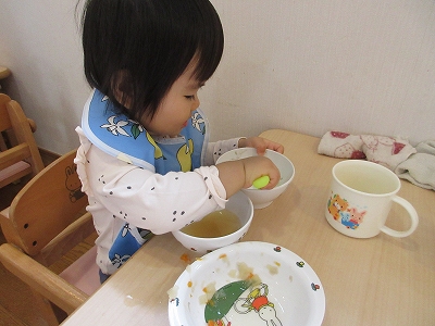 手づかみ、食具を使用する、など自分で食べることが多くなってきました。