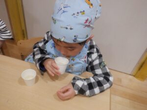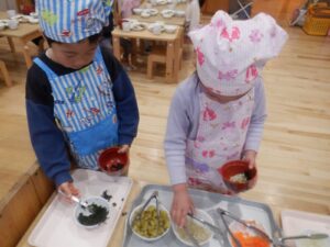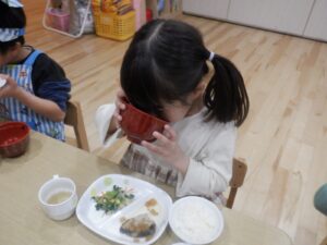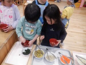 普段のケーキ作りなどと少し違い、渋めの内容でしたが和食好きが多いもも組にはヒットしたようです。その後はみそ汁の具をバイキング形式で選び、自分だけの味噌汁が完成!しっかり完食し、おかわりがあっという間になくなりました。