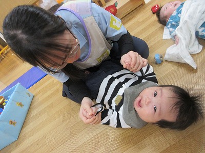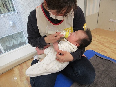 徐々に保育園が安心できる場所となり、たっぷりミルクを飲んだりぐっすり眠ったりおもちゃを目で追いかけたりとのびのびと活動しています。