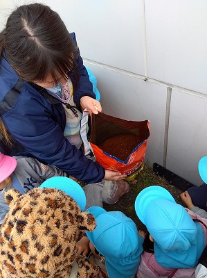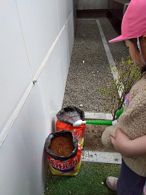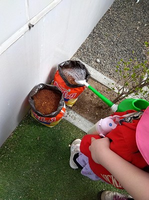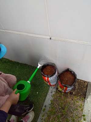 そのあと中庭へ出て実際に種いもを植え、みんなでお水をあげました。