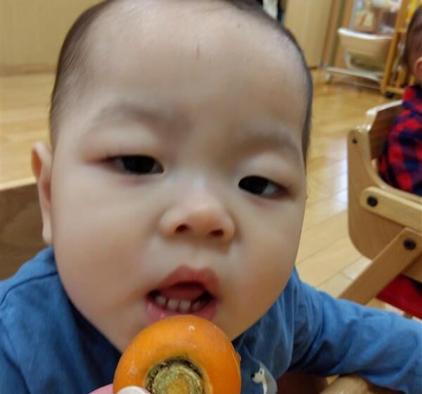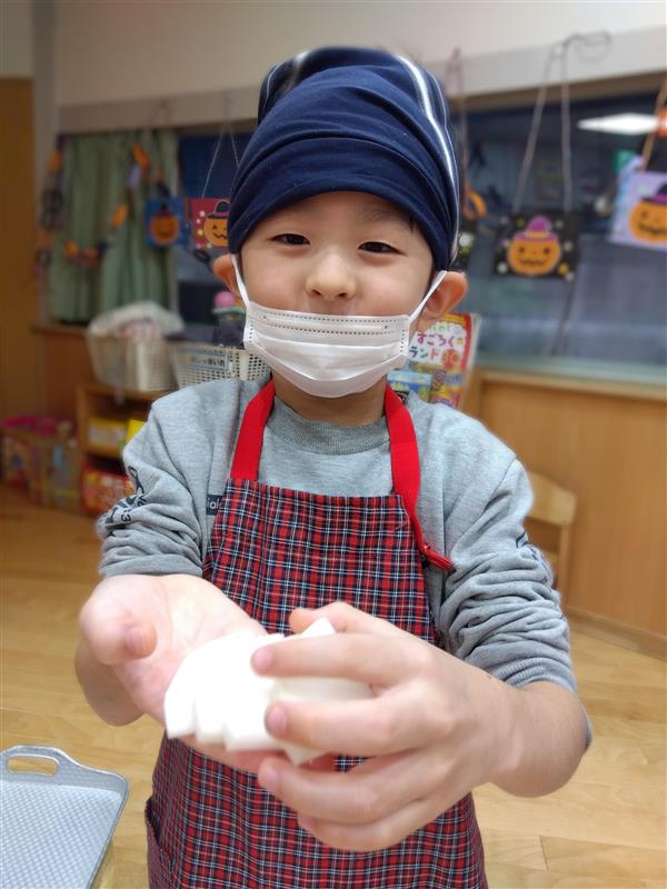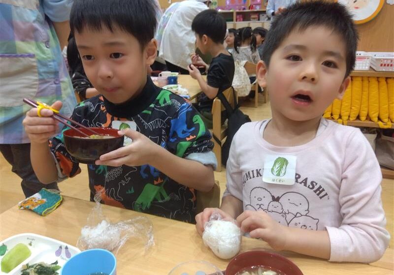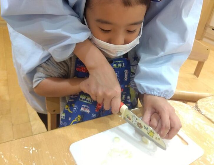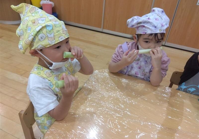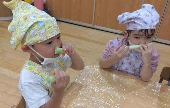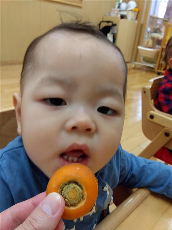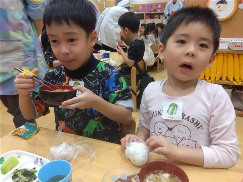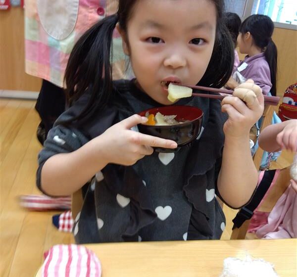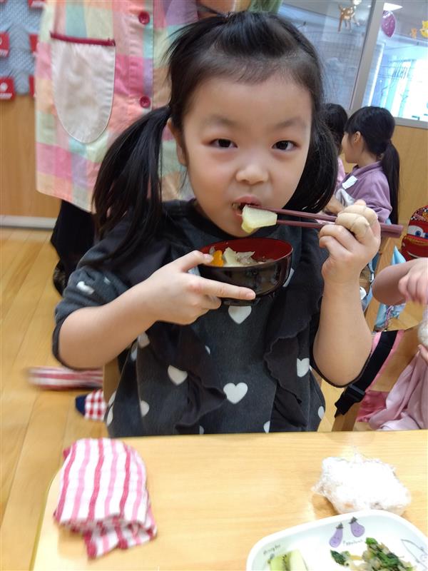 野菜に触れてみるだけでなく、人参と大根の皮をピーラーで剥き、その後型抜きをしてみたり、包丁を使って野菜を切ることに挑戦しました(o^―^o)最後には子ども達の前で味噌を入れ芋煮の完成を見ました。給食では、おにぎりと一緒に芋煮も食べましたが、たくさん作った芋煮も空っぽになるまでおかわりをしていましたよ☆彡