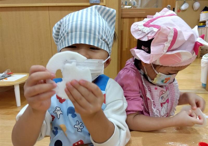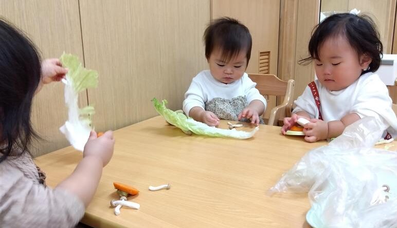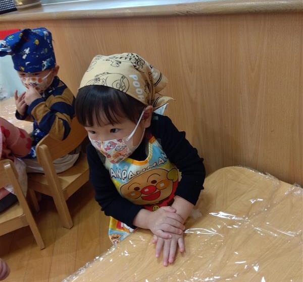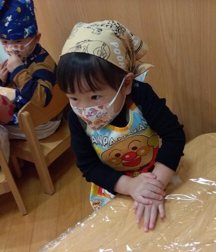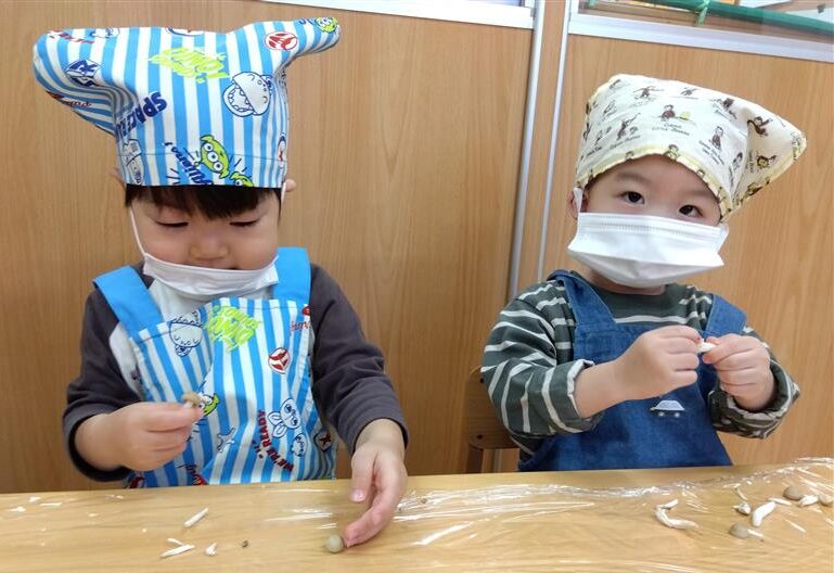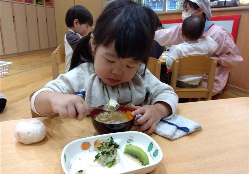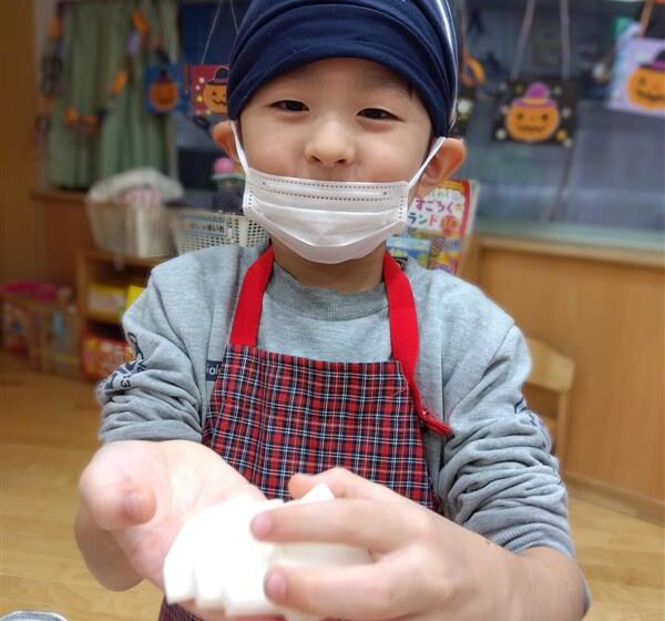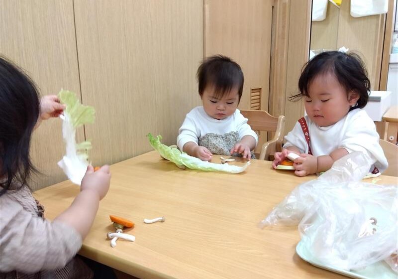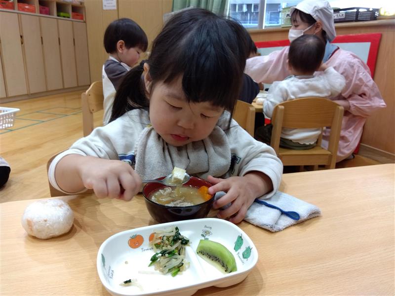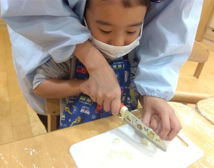 野菜に触れてみるだけでなく、人参と大根の皮をピーラーで剥き、その後型抜きをしてみたり、包丁を使って野菜を切ることに挑戦しました(o^―^o)最後には子ども達の前で味噌を入れ芋煮の完成を見ました。給食では、おにぎりと一緒に芋煮も食べましたが、たくさん作った芋煮も空っぽになるまでおかわりをしていましたよ☆彡