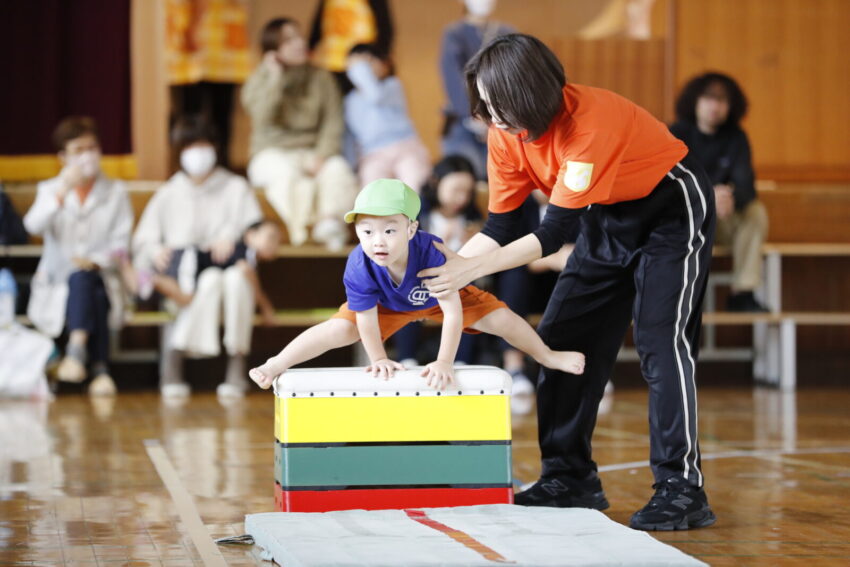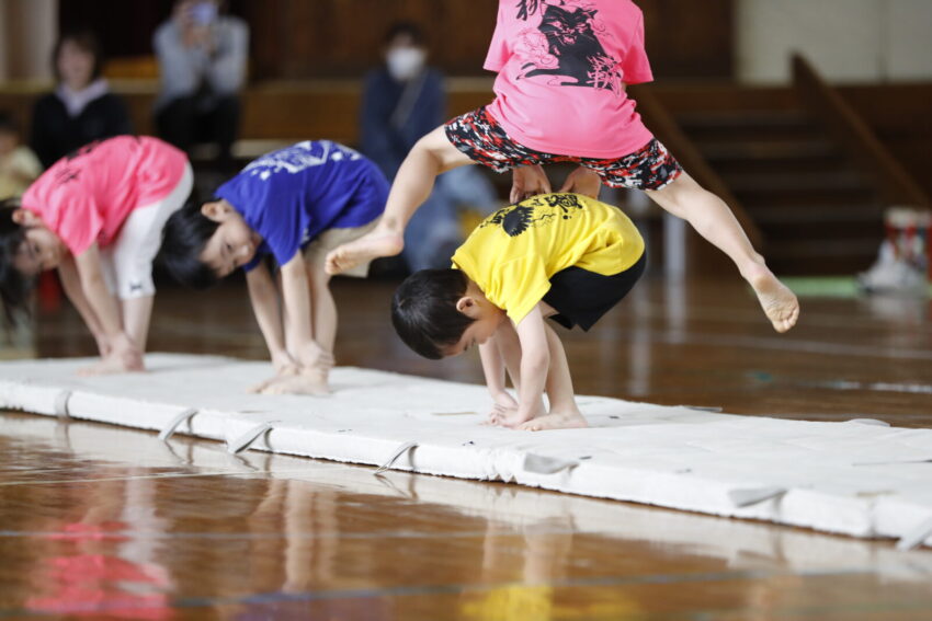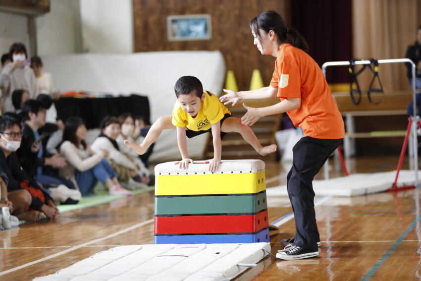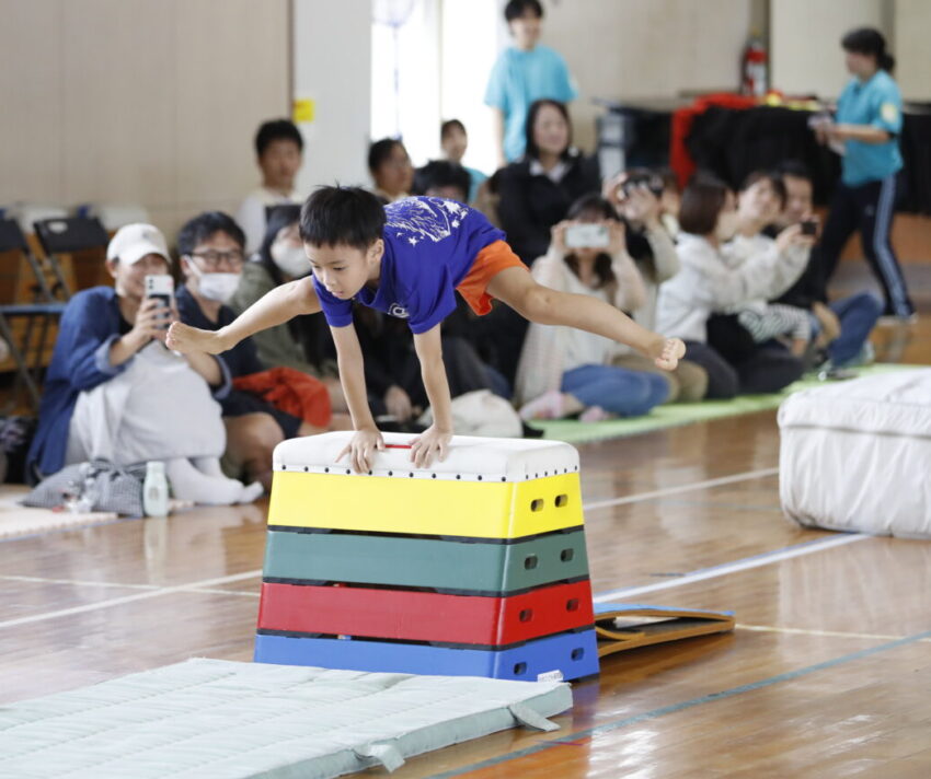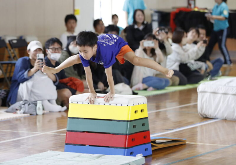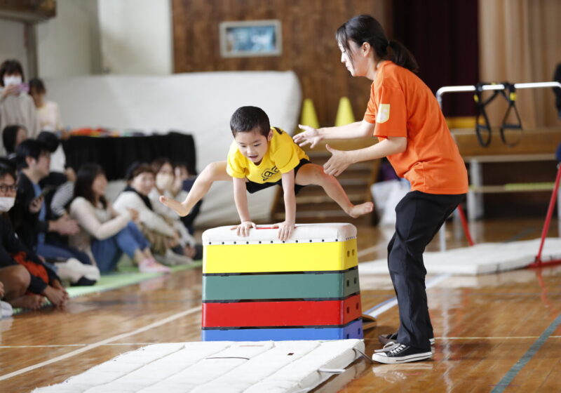 跳び箱、鉄棒、縄跳びなど、小学生レベルの技に挑戦したり、各クラスで取り組んでいるマット運動の合わせ技など、