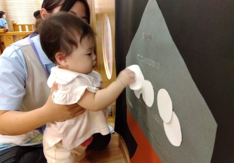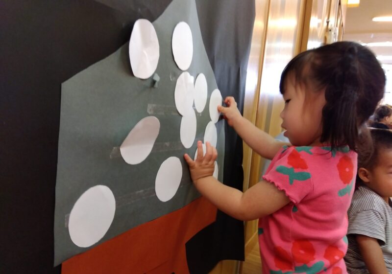 3歳児クラスが貼っている際、気になった0歳児さんが近くへ行くと「やりたいの?はい!いいよ」と優しく迎え入れる場面があり、異年齢児の交流に微笑ましくなりました。