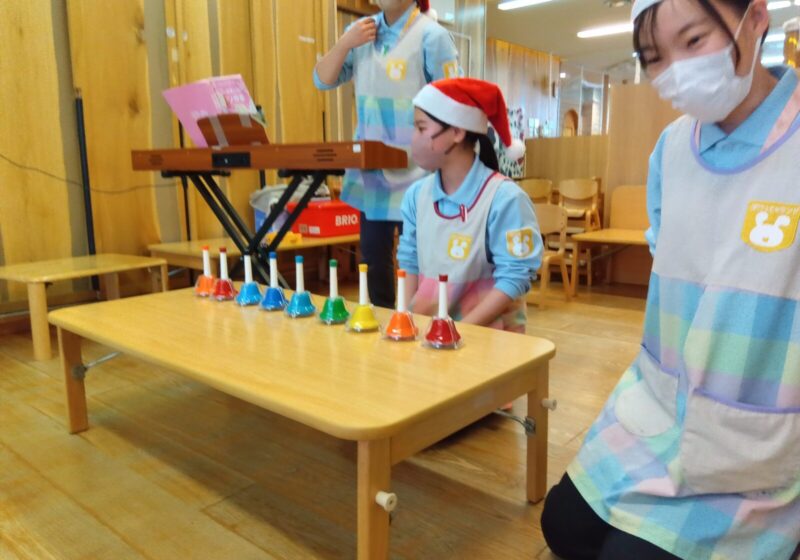「とんとんとんとんクリスマス」の手遊びをしたり、ハンドベルとピアノに合わせて、子どもたちと「ジングルベル」を歌ったりしました。