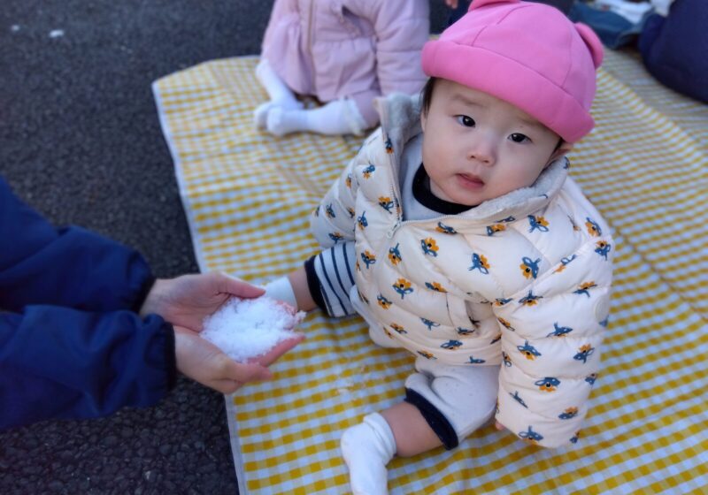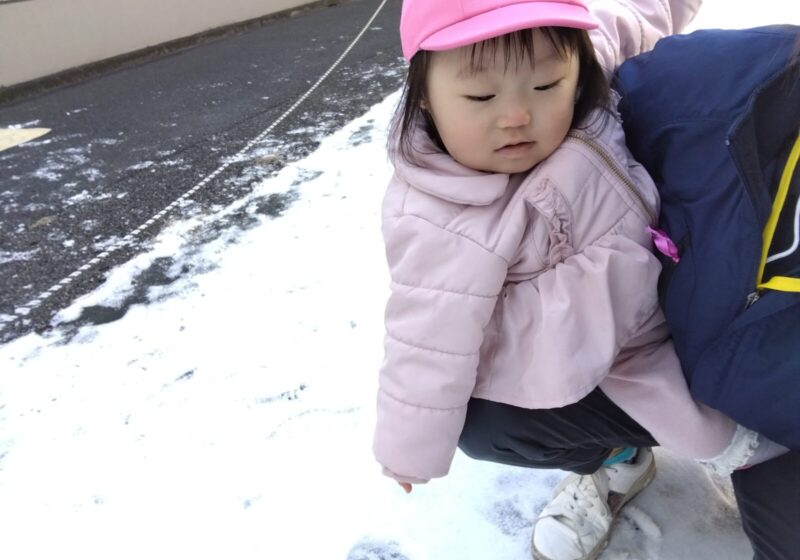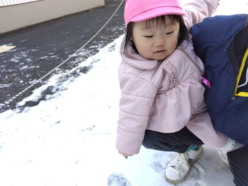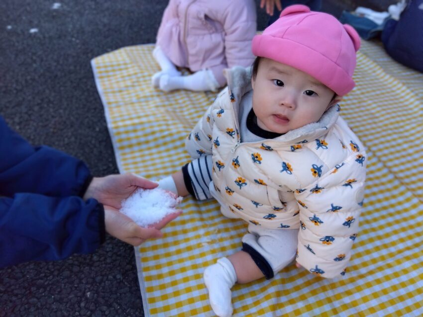 子どもたちの手に雪を近づけると、初めての雪や冷たさから涙を見せる子もいましたが、保育者やお友だちが楽しそうに遊ぶ姿を見て、目で追ったり指で触ったりと、少しずつ慣れている様子でした。