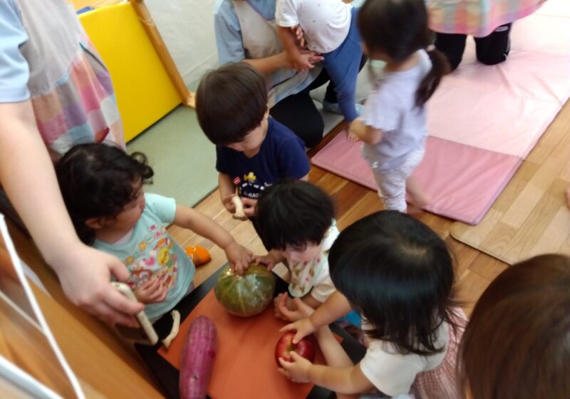 そんなお話を聞いたり、大好きなさつまいもやぶどうが育っていく様子を写真を通して見て楽しみました。そして実際に秋ならではのお野菜にも触れました。
