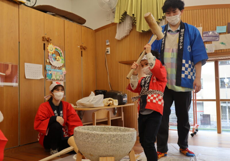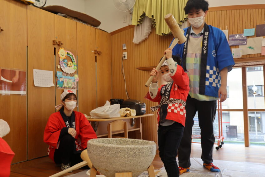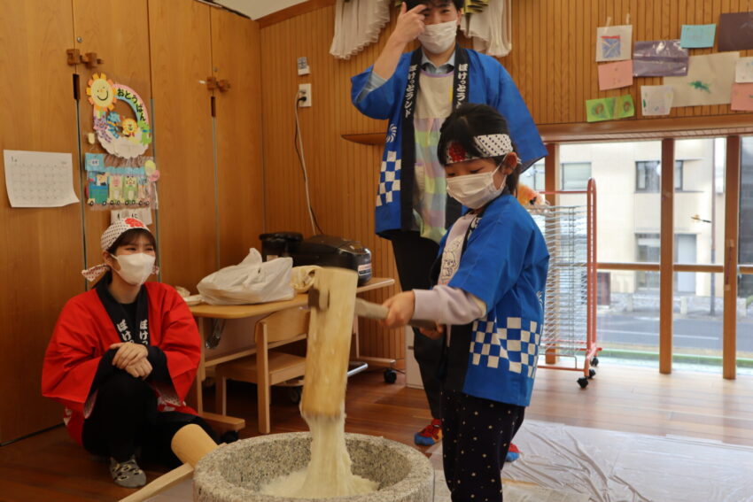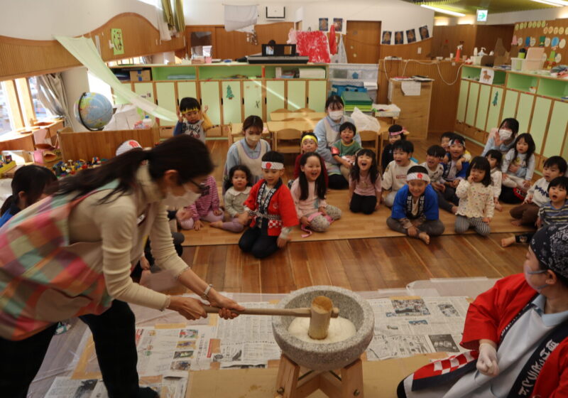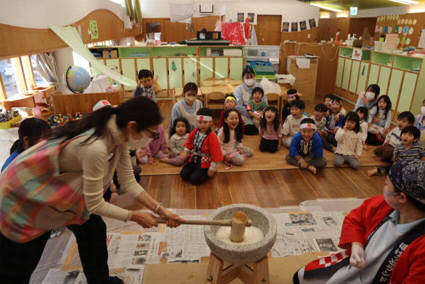 保育園では、みんなが集まり『おもちつき』をしました。まずは、もち米について栄養士さんから話を聞きお米を研ぐというところから挑戦しました。それから、炊飯器にお米を入れると「いいにお~い」と鼻をクンクンさせて、炊けたもち米を匂いに触れていました。幼児クラスのお友達の力や乳児クラスのお友達の応援する力を借りてもちつきに挑戦しました。「がんばれー」と元気いっぱいに応援してくれるお友達と最後は、園長先生の力を借りて臼にいっぱいのお餅が完成しました。なかなか、最近では、もちつきを体験する機会も減りましたが、「よいしょ~」と力を入れてもちつき体験ができました。できあがったお餅の感触や匂いに最後は触れて過ごしました。