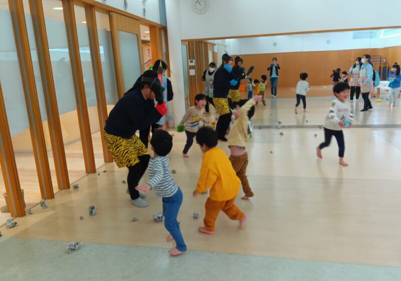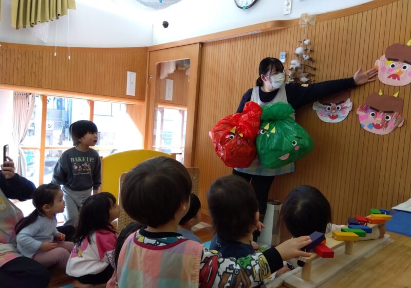 毎年、「節分」となるとびっくりしてしまうお友達もいるようですが、今年度は節分について保育者間でどうしていくべきかを考え子どもたちがびっくりしてしまわないように保育者の顔がわかりやすいようなお面にして豆まきをしています。最後には福の神さんも登場して福をたくさんいただきました。