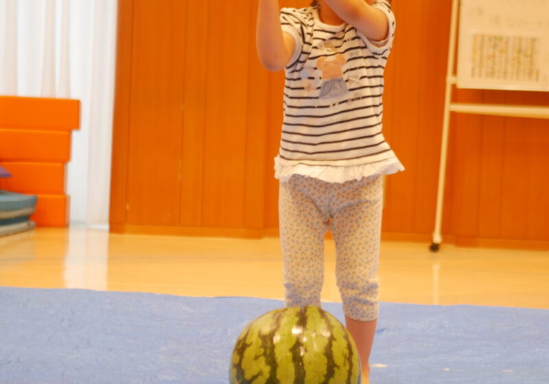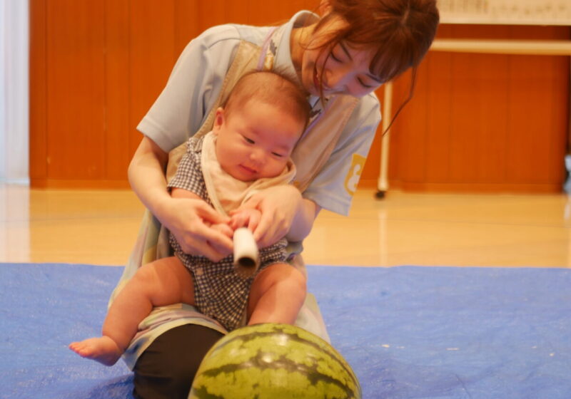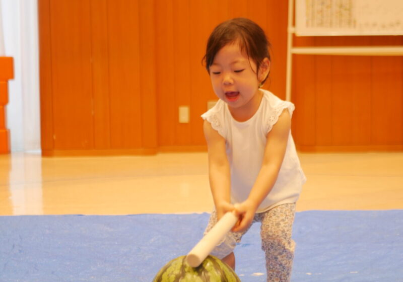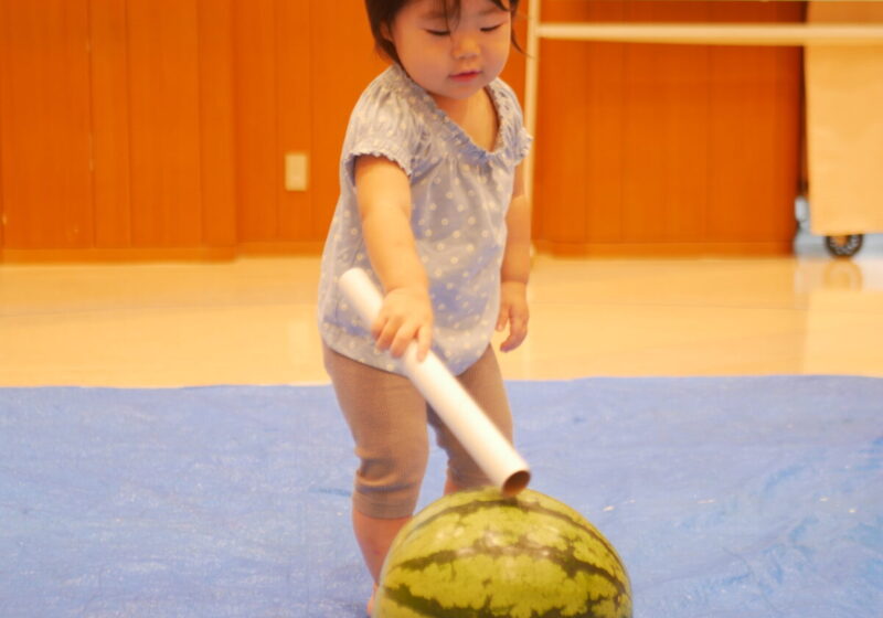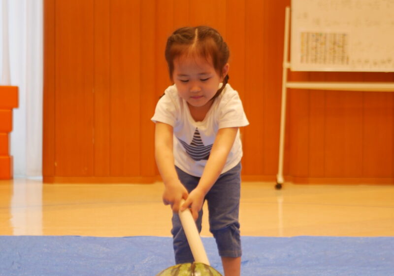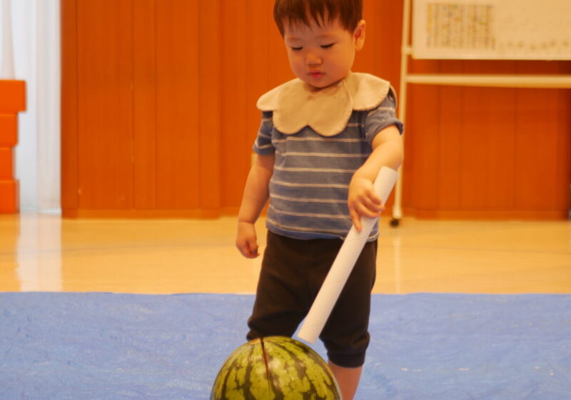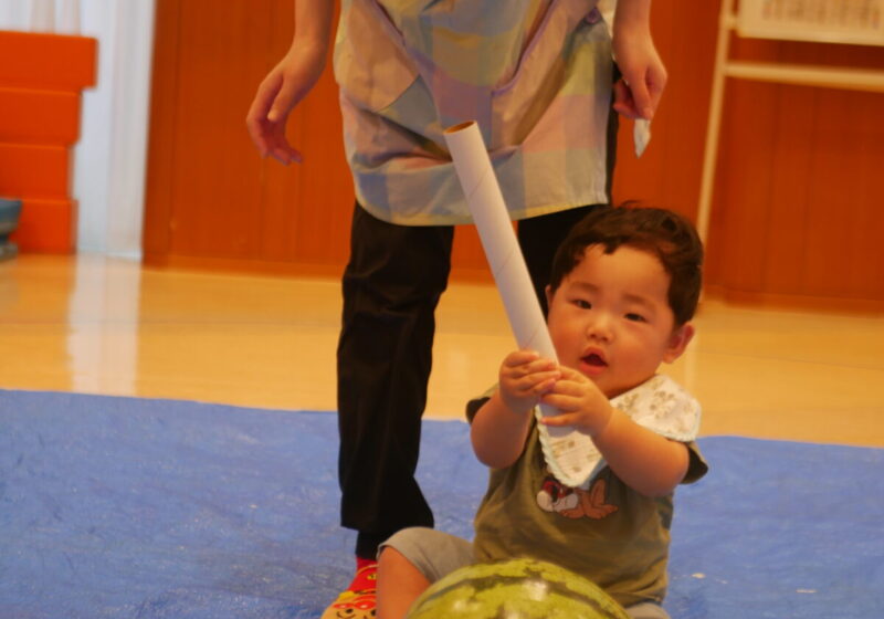 スイカを触ってみたり、保育者と一緒に棒を持ちスイカを叩きました!