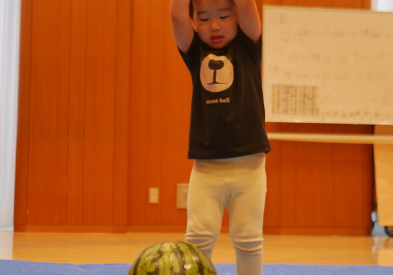 何をするのかを分かっている2歳児の子どもたち!一人でも堂々と棒を持ち、力を入れながらスイカをしっかりと狙って叩いていました!