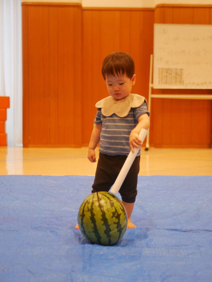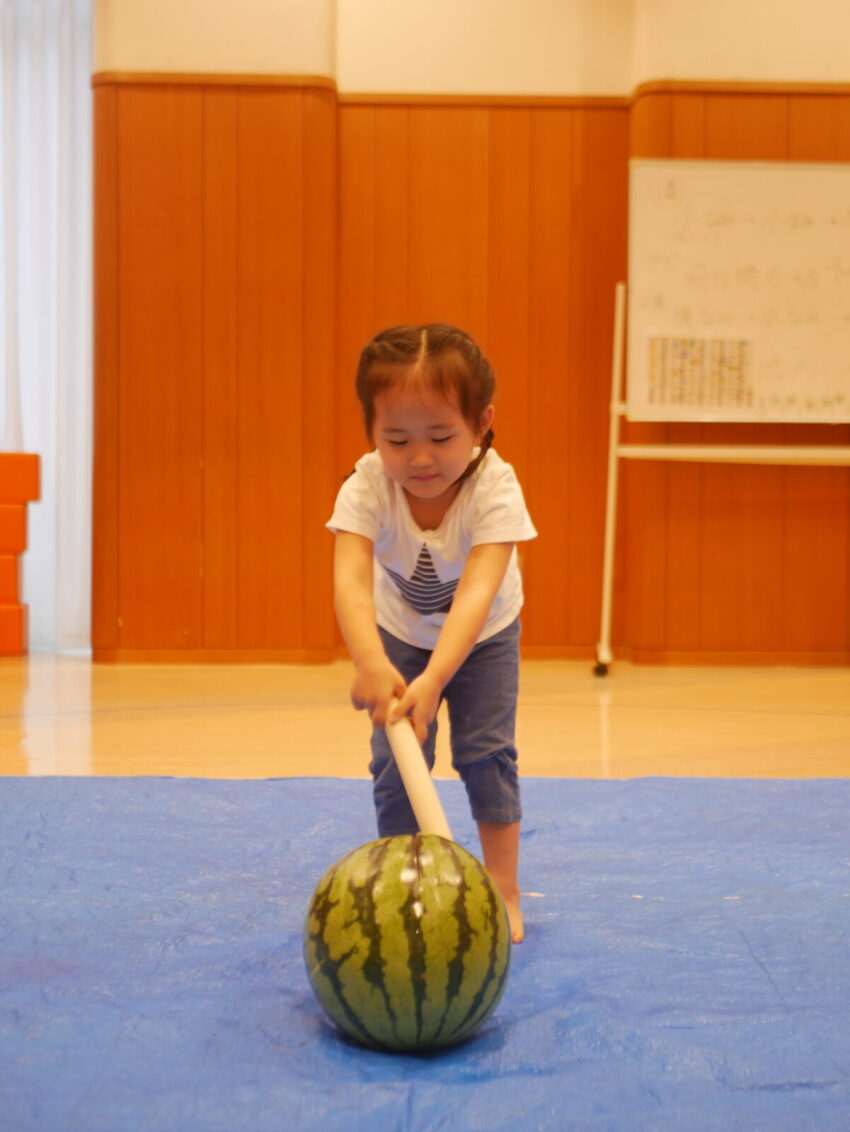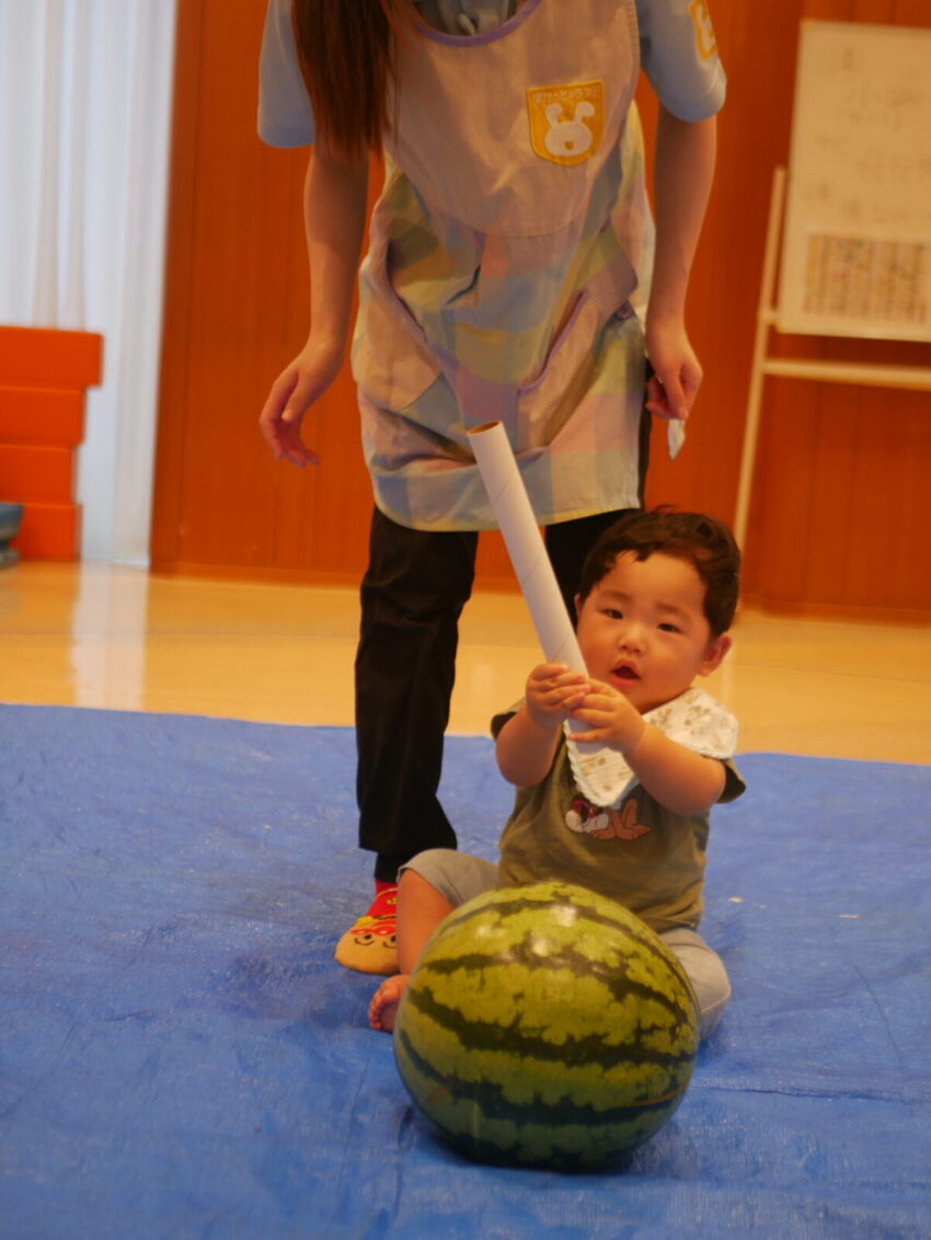 スイカを触ってみたり、保育者と一緒に棒を持ちスイカを叩きました!