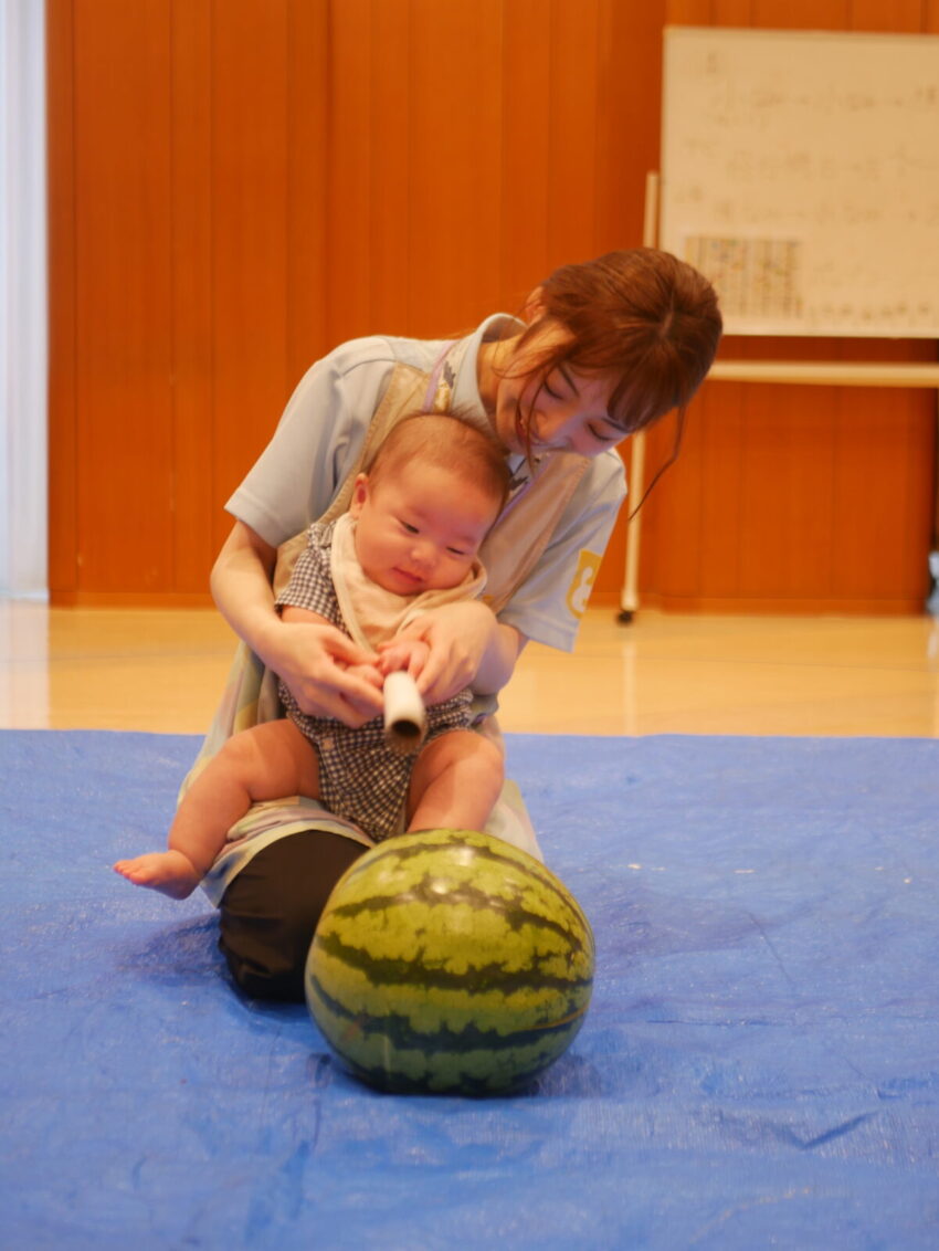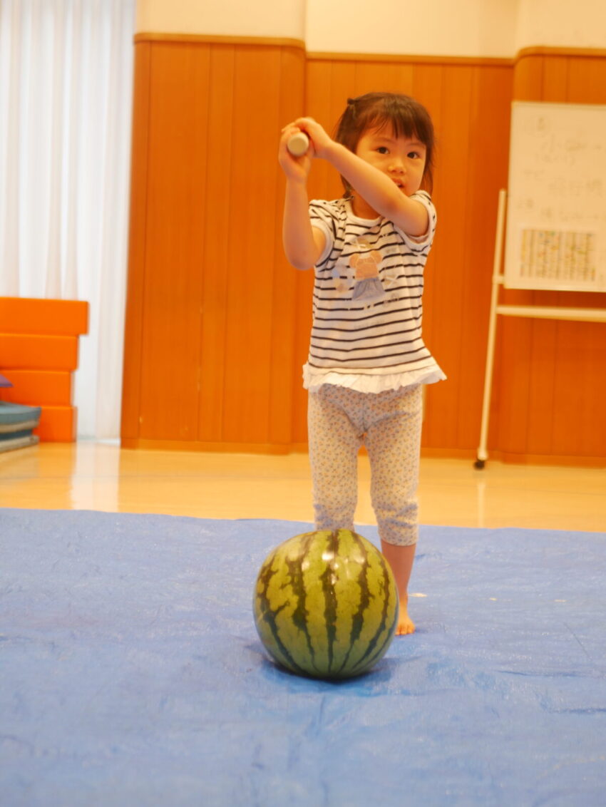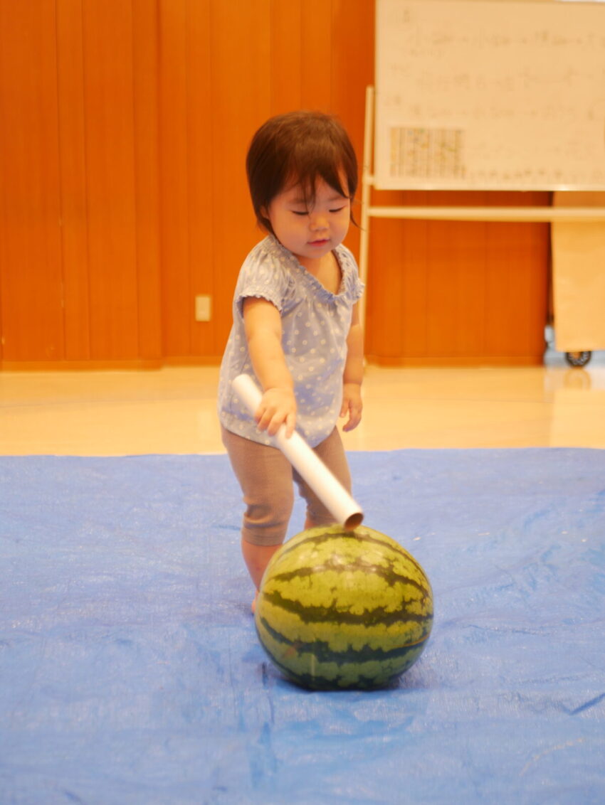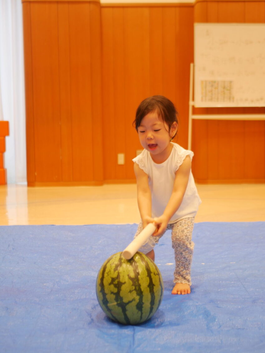 スイカを触ってみたり、保育者と一緒に棒を持ちスイカを叩きました!