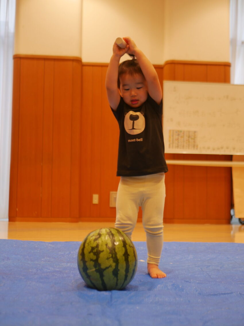 何をするのかを分かっている2歳児の子どもたち!一人でも堂々と棒を持ち、力を入れながらスイカをしっかりと狙って叩いていました!